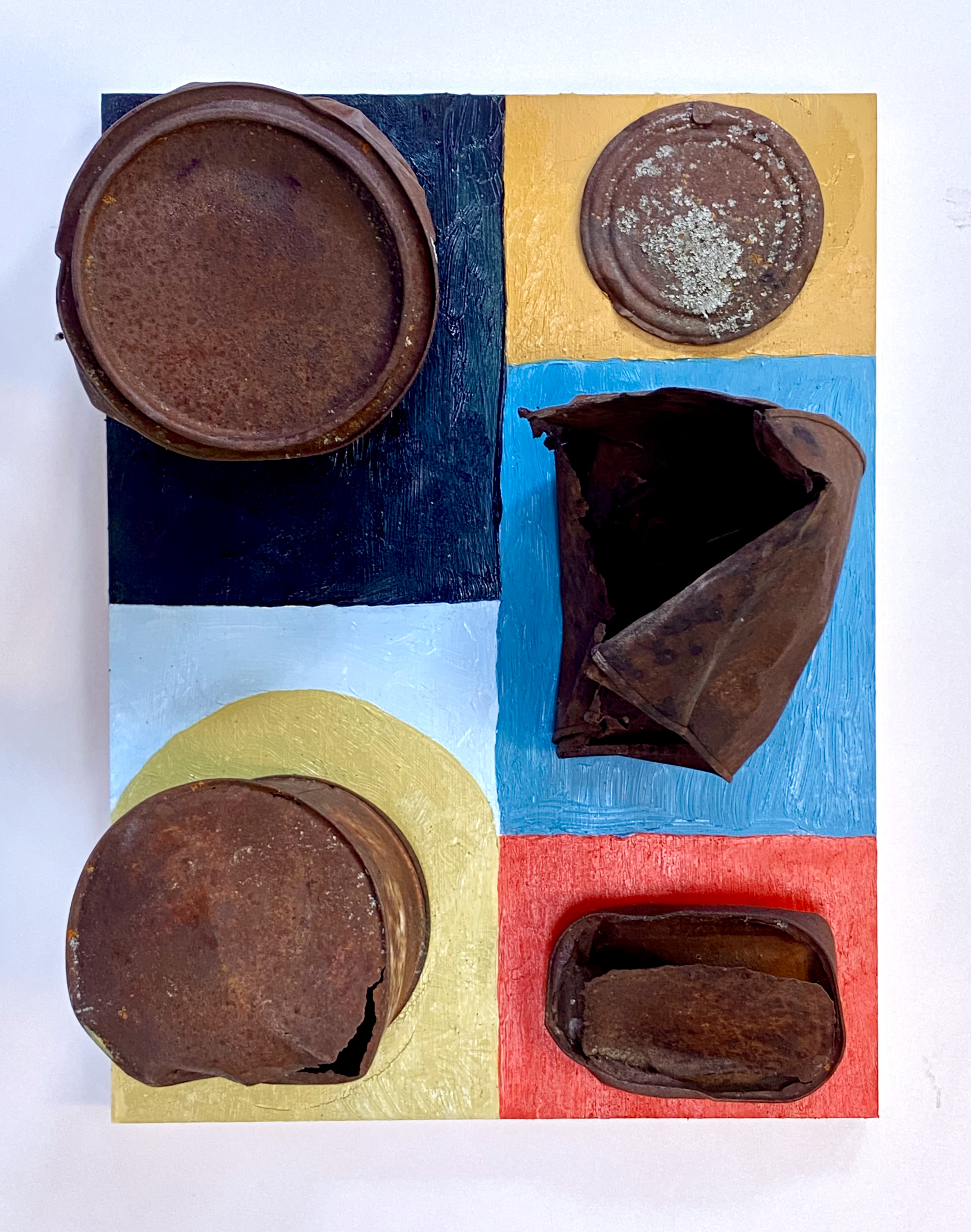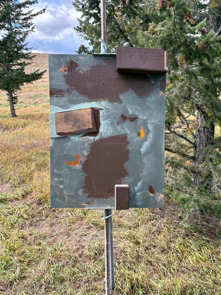 I also make pictures where I both paint areas or marks, and affix objects to wooden panels (and paint on them, too). These are often done outdoors, letting my intuition be informed by the environment which is most often where I collected the object(s) and/or the support, from.
