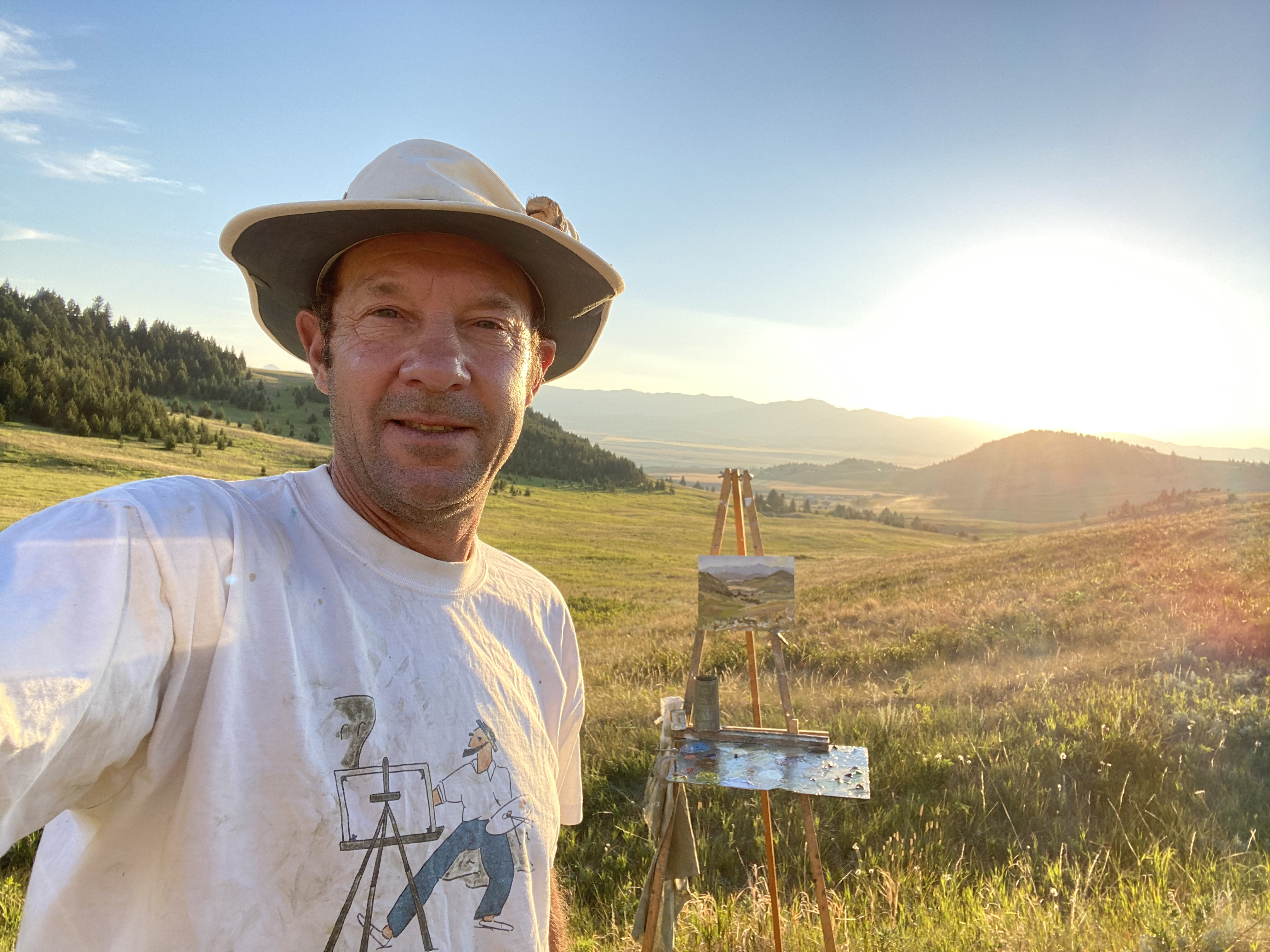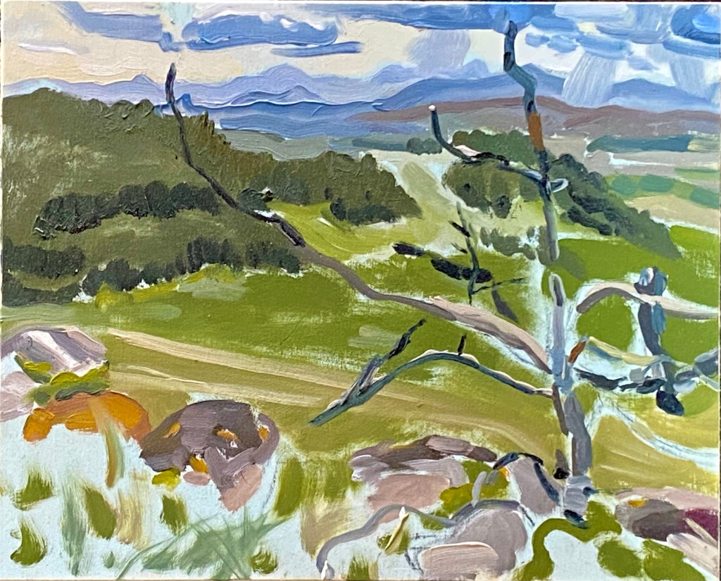 The variety of painting types happen in my studio. But in parallel I paint “en plein air”. I’ve done this for over 30 years. I make these small paintings in an observational (mimetic/imitative) style; or, I may depart from that by using my own colours and figuration, and by letting the brushstrokes communicate.