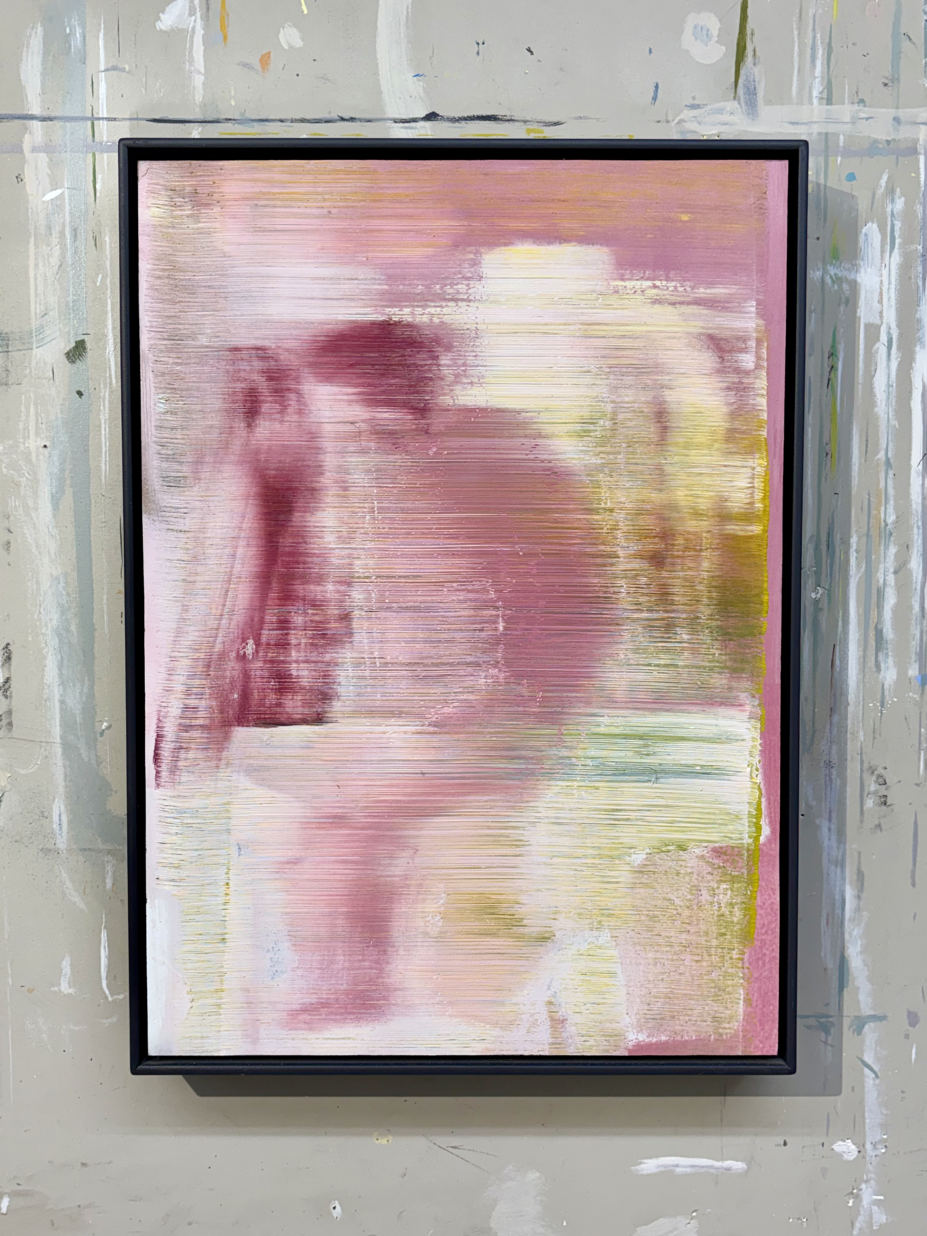 This was one of my first large brush paintings, done right in one of the studios near the start of my BFA, this one in 2001. By then I had found and started trying out my “large brush”. This was actually a high quality industrial door seal although I didn’t know where it came from at the time – I found it on a busy street bent into a bow shape from all the cars that had been driving over it. Also, the image was not made in the usual way of intending to depict something; rather, it emerged from choosing some paint colours and some places to begin brushing it from. It really reminded me of students and of of my own figure straddling one of the wooden drawing stools they used in the studios, with something in the background the teacher would set up for us to study and draw.