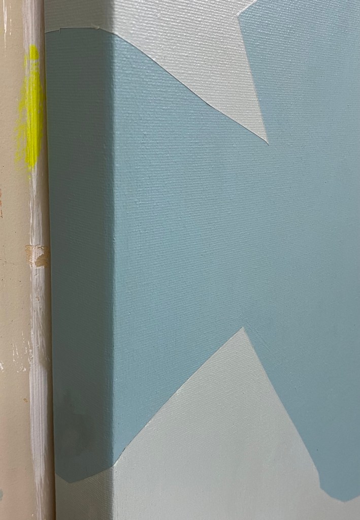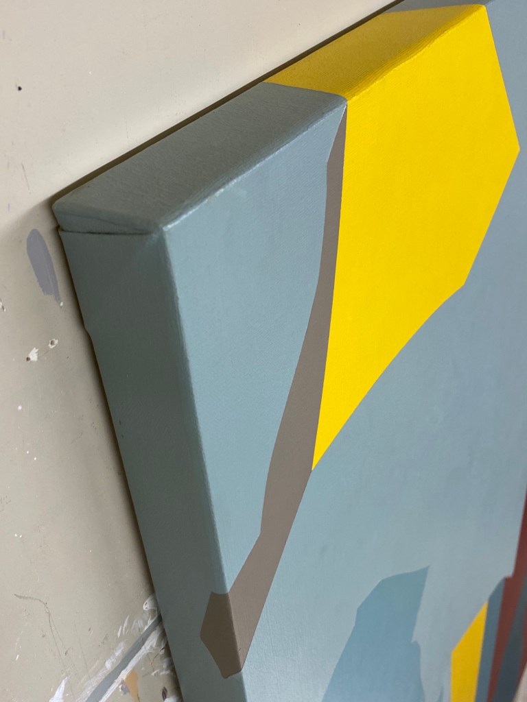 This picture is painted on all sides of the stretcher. I think this was done out of pure intuition and desire to “finish” the entire object (stretcher). This perhaps diminishes the “read” as a window or illusion of space. Perhaps it added something of benefit. The imagery and colour was influenced by Japanese visual art and the idea of day and night in the same frame. The dark side contains an example of one of Josef Albers’ remarkable studies. The shared, “sharp” edge of two colours with very different hue (here the mountain/moon motifs versus the night sky) can “blur” in our sight (like how things can look at night). Also, the moon is only slightly “more colourful” than the mountain but looked at carefully, our visual sense lets it “pop”.