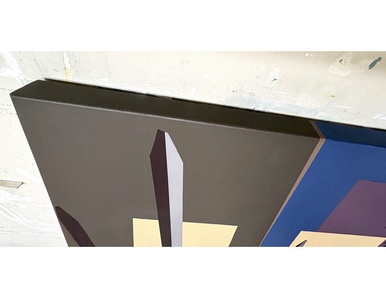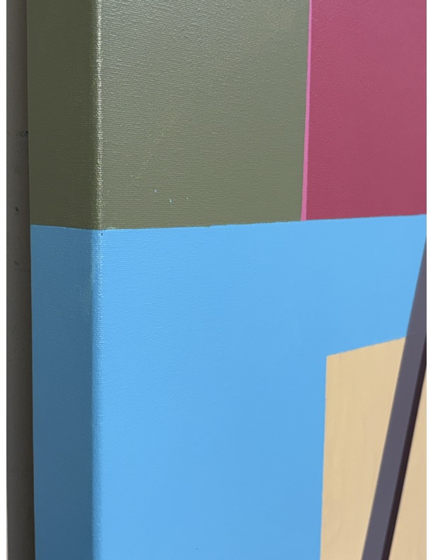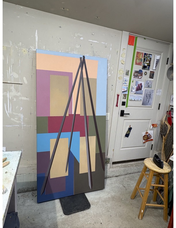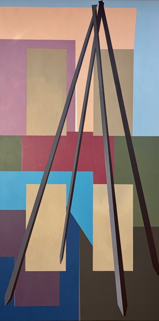 This picture is painted on all sides of the stretcher; as if, along with its size, to emulate an object namely a door. The imagery can refer to architecture. The background can refer to a building such as a condo or retail building above the earth below the surface. The foreground can refer to a tipi. Tipi’s are popping up in urban centres. Tipi frames present a classical geometry of a kind. Perhaps they cooperate with (if not “out-do” most settler architecture) (such mainly rectangles and boxes built for their expediency). This representation of a frame emulates angle iron pieces, which I painted from, semi-observationally. The angle irons thusly arranged and left bare in their setting, suggest a construction project underway; maybe a tipi reaching up to the height of the city.